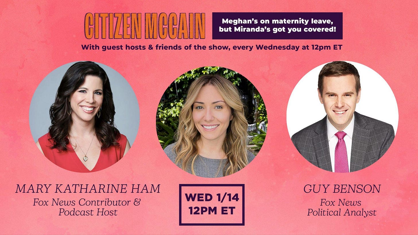 Miranda is joined by Fox News contributor & podcast host, Mary Katharine Ham, and Guy Benson, Fox News Political Analyst on “Citizen McCain” LIVE at noon ET.
