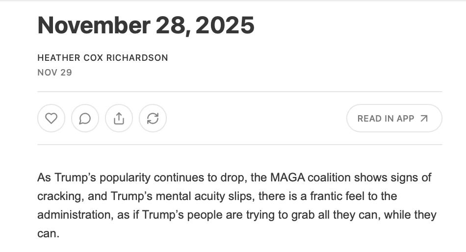 Once one is SURE that this time it’s for real -- that Trump is done and dusted and the next three years are just falling action leading towards his eventual demises -- nearly every news development can be seen through this prism, such as the quality Politico story about the overwhelming number of judges who have ruled against the administration in deportation/immigration cases, to the Washington Post exclusive on Secretary Hegseth’s Caribbean strike orders.