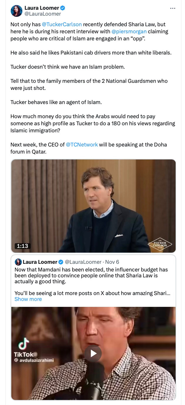 There’s also the intra-MAGA fight over allegations of pro-Islamist sentiment inside the tent, a charge often connected to allegations of payola, via Loomer: