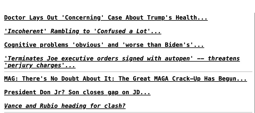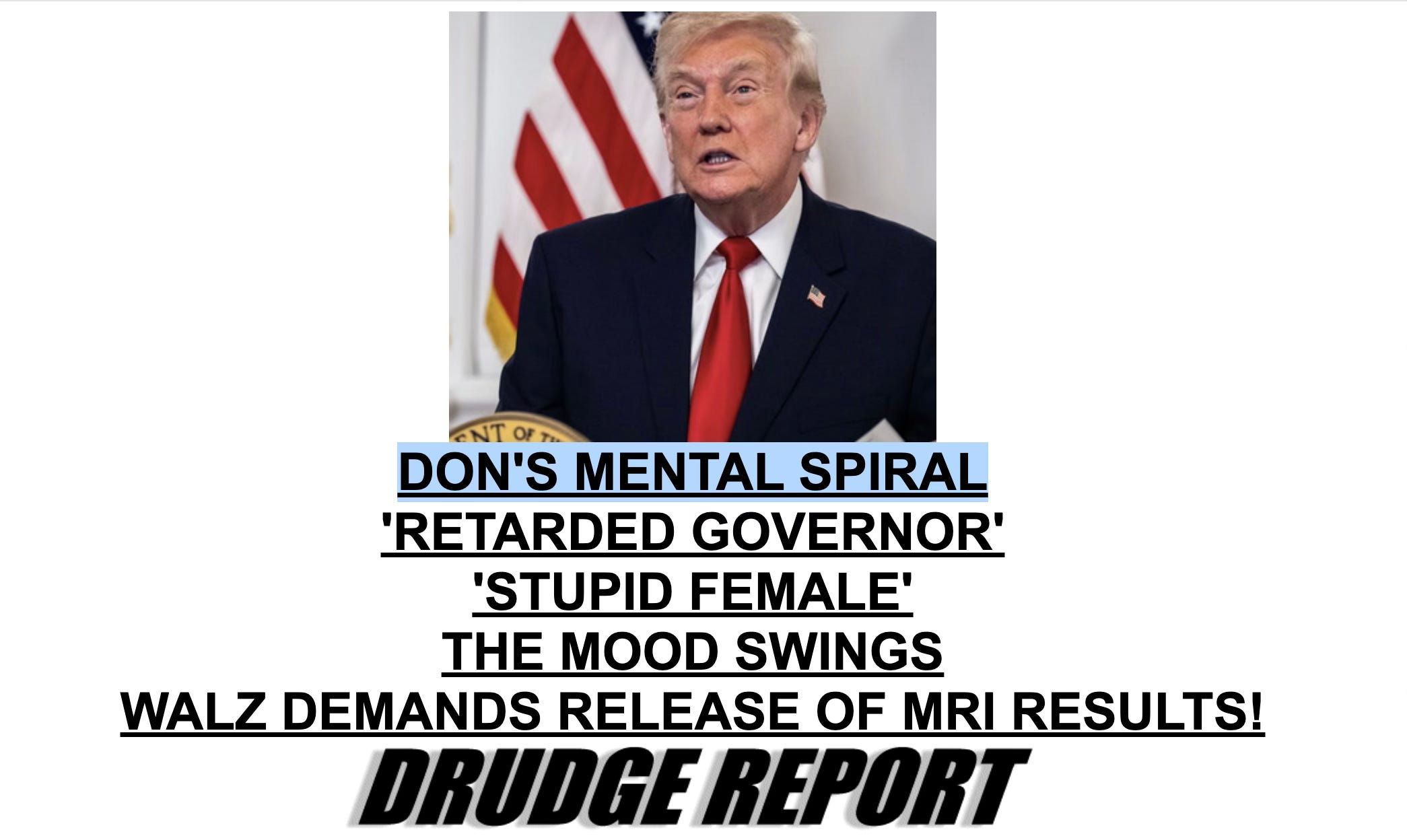 On the Blue side, the story is the presumed simultaneous mental, physical, and political demise of Donald Trump, happening right before the eyes of Matt Drudge: