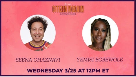 * Yemisi Egbewole and Seena Ghaznavi join Miranda LIVE at noon ET on “Citizen McCain.”
