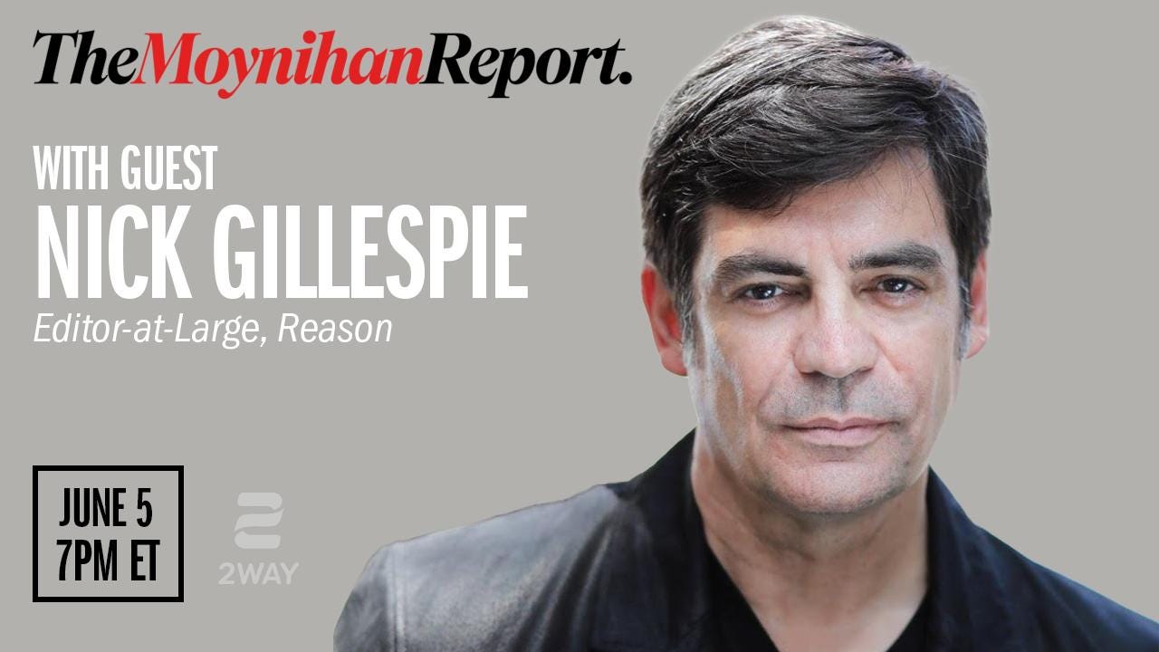 Michael Moynihan is joined by Nick Gillespie, Editor-at-Large at Reason, on “Moynihan Report” LIVE at 7pm ET.