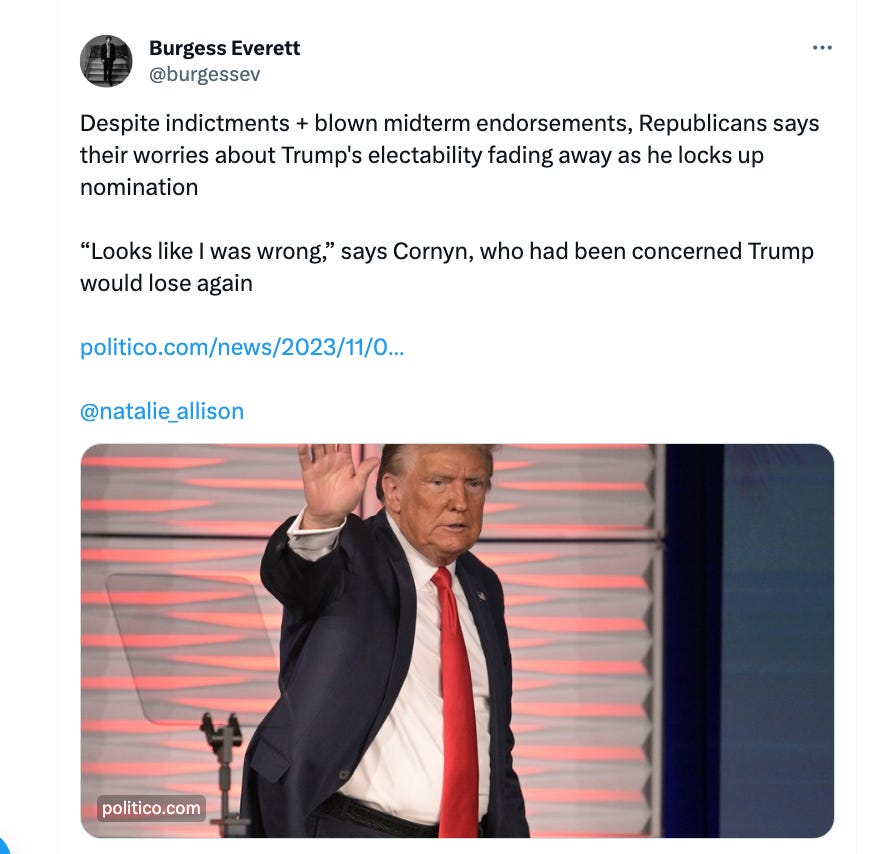 3. One more essential read, leading into tonight’s Republican debate: Politico on the demise of the electability argument, as Republican Senators and other elites accept both the high likelihood that Donald Trump will be the nominee and the data that shows he can beat Joe Biden:
